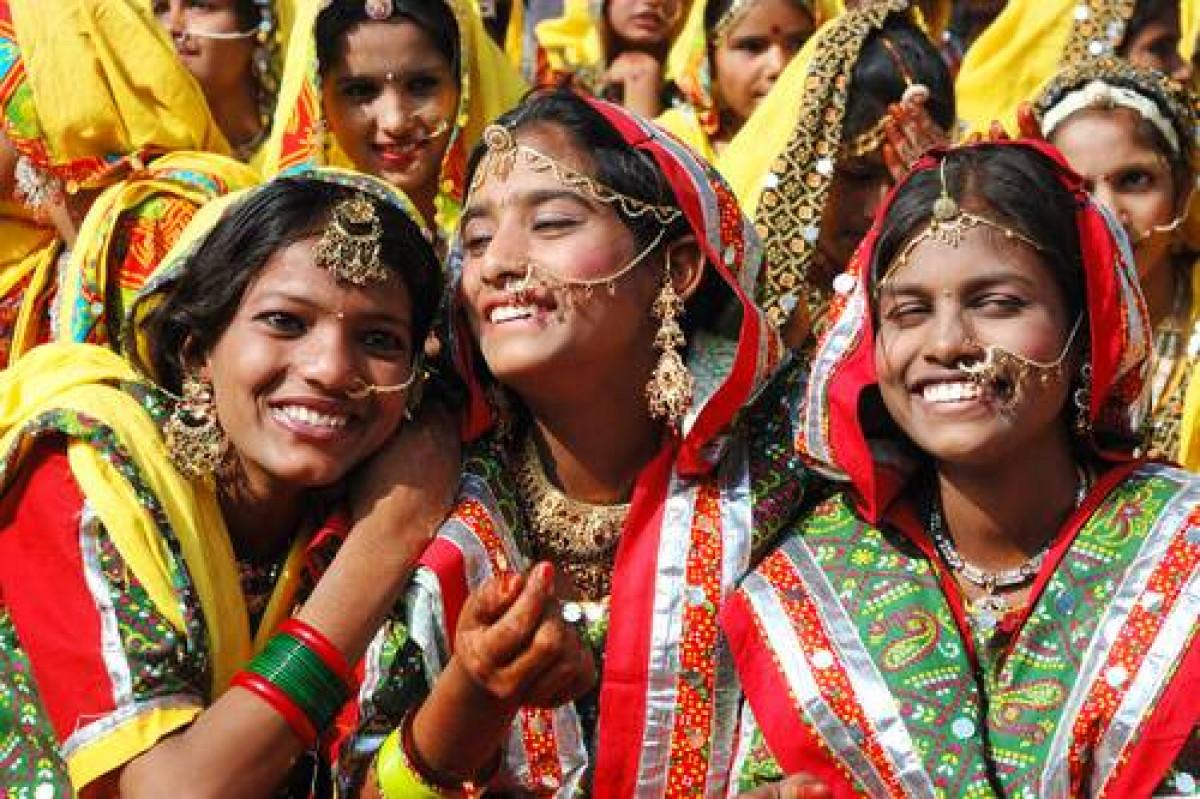 Indian women smiling. Three Indian women dressed in traditional Indian clothing take part in a festival of some sort on a sunny day. The traditional clothing for females in Indian is quite broad when it comes to styles, and is awfully dependent upon the religion, ethnicity, and region in which they live. One of the most popular garments are what is called a Sari. These are long, unstitched pieces of cloth that women wrap around their bodies. What is seen in this photo is called a Lehenga. This is a long skirt that is pleated and has a thick boarder at the bottom.