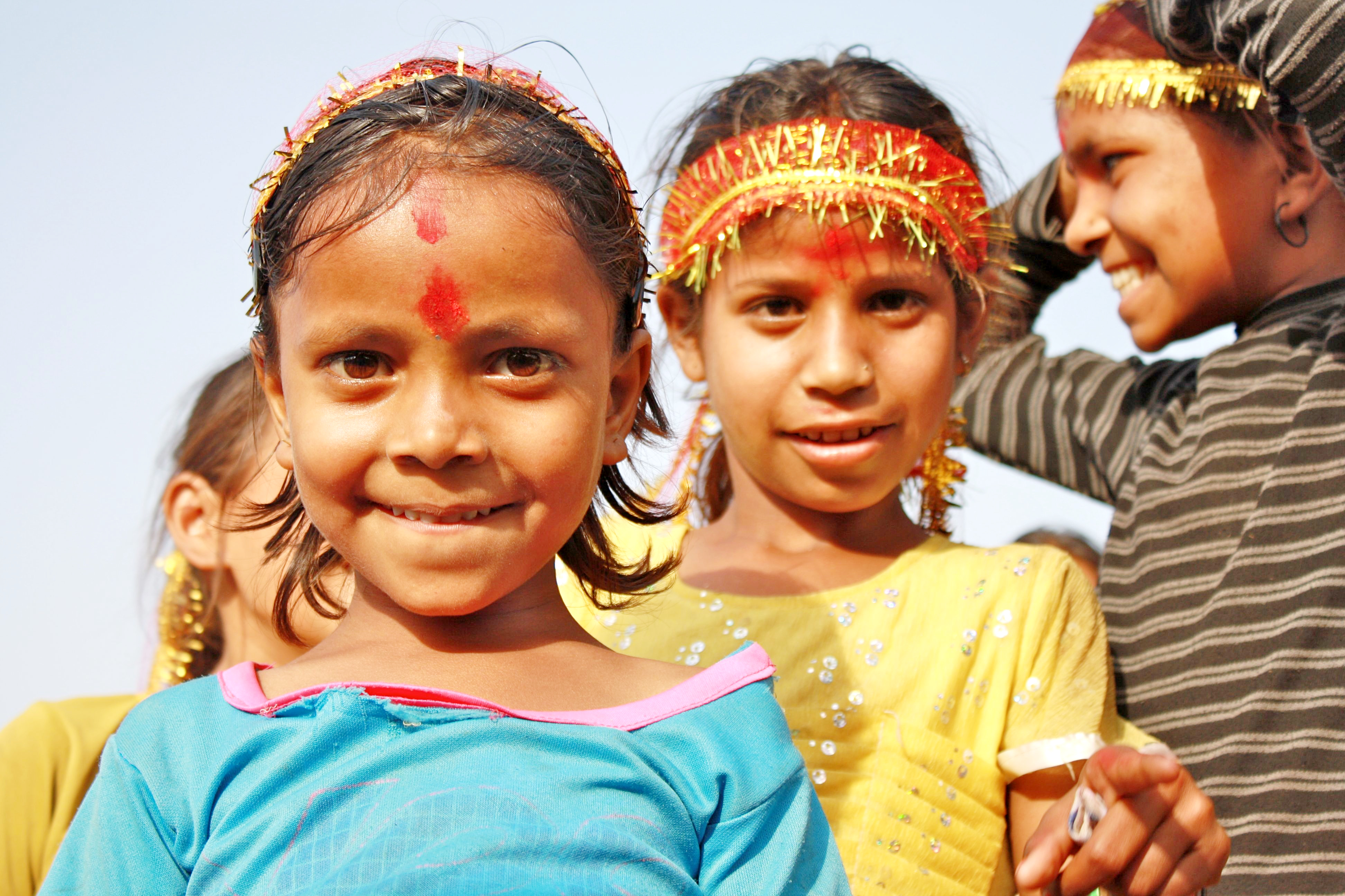 Indian children pose for camera. Children in India are taught about tradition both from a religious and ethnical standpoint. Children do not usually wear the same attire as their parents or other adults would wear. Kids, especially girls wear what is called a Pattu Pavadai. This is a traditional dress with a cone-shaped skirt, typically made of silk and goes from the waist to the toes. Children do wear the red dot between their eyes, which usually symbolizes strength and love.